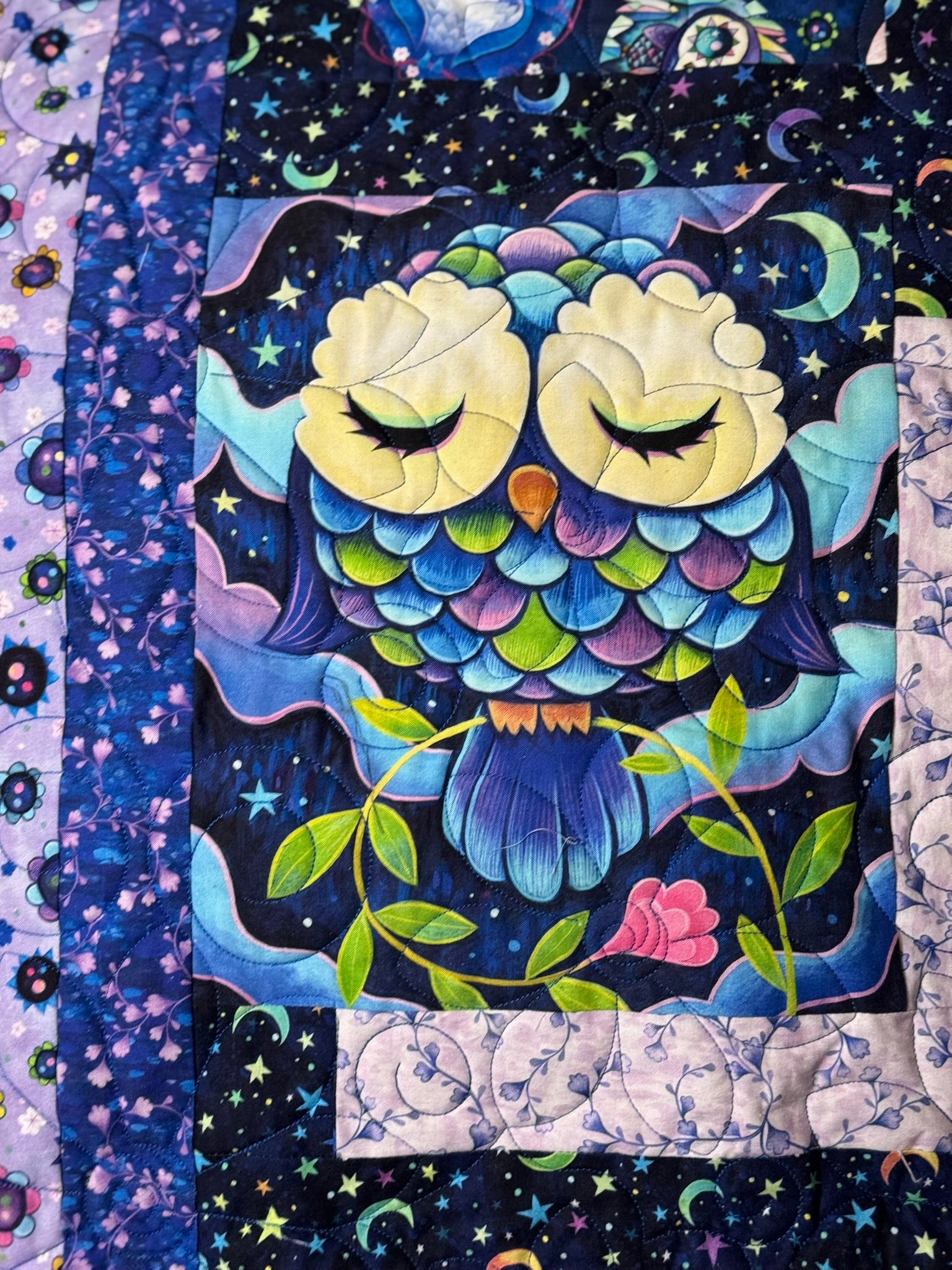 The playful owl blocks are framed with black sashing scattered with multicolored moons, adding contrast and a touch of nighttime magic. Surrounding the design is a rich, layered two borders, one light purple with flowers paired with one of deep purple vines—creating depth and movement throughout the quilt.